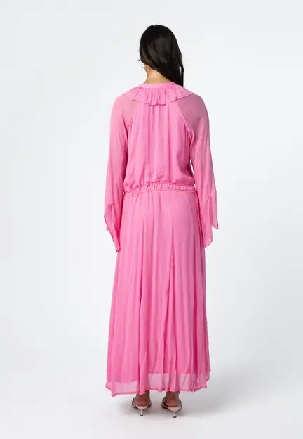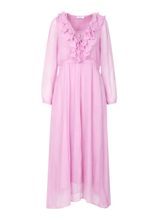Volant frills cascade down the front, adding delicate texture and fluidity, while soft ties at the neckline enhance its feminine charm. The long sleeves are finished with elasticated cuffs, creating subtle volume and a softly gathered shape. Elegant and effortless, this dress is perfectly suited for special occasions, weddings, and elevated event dressing.
