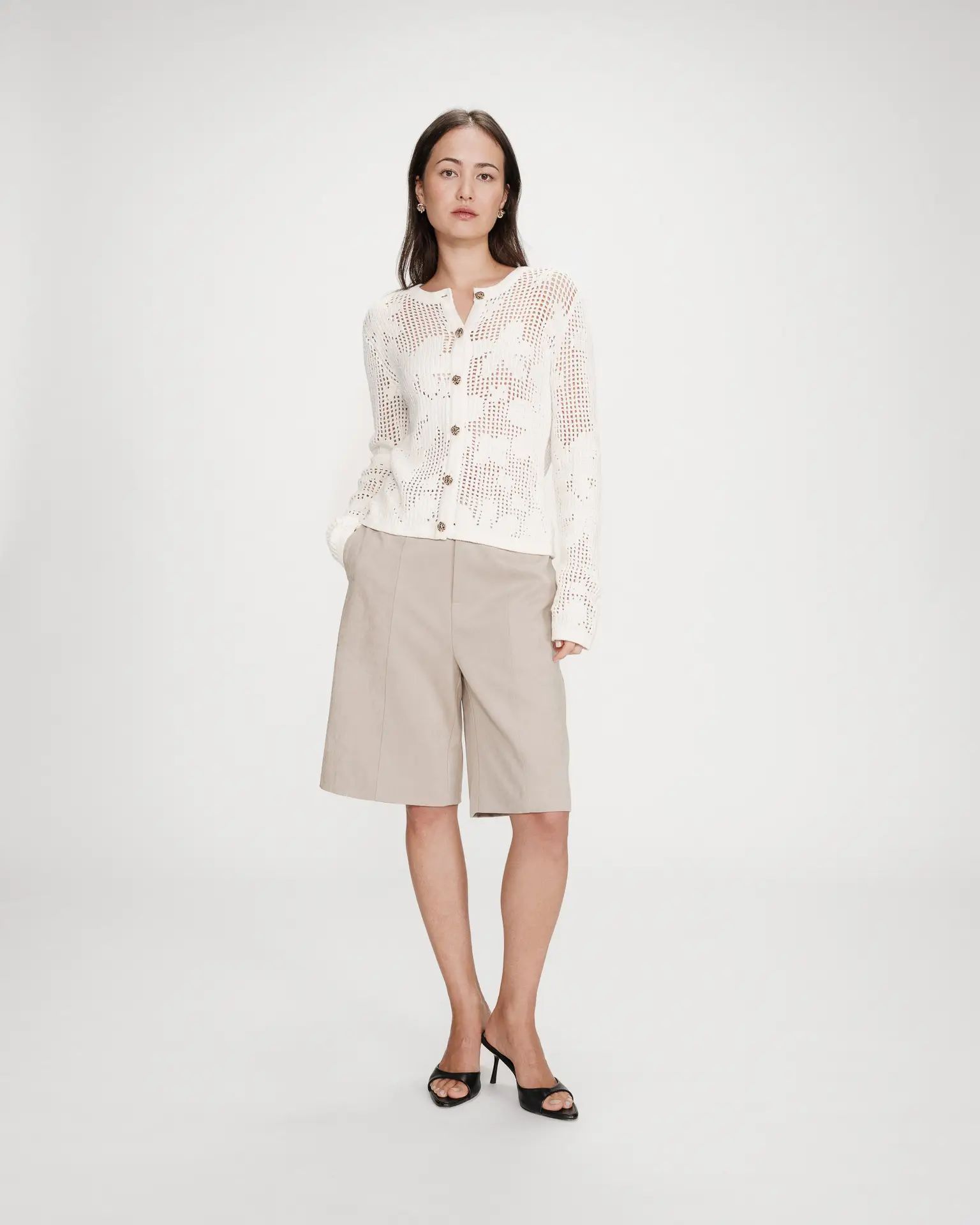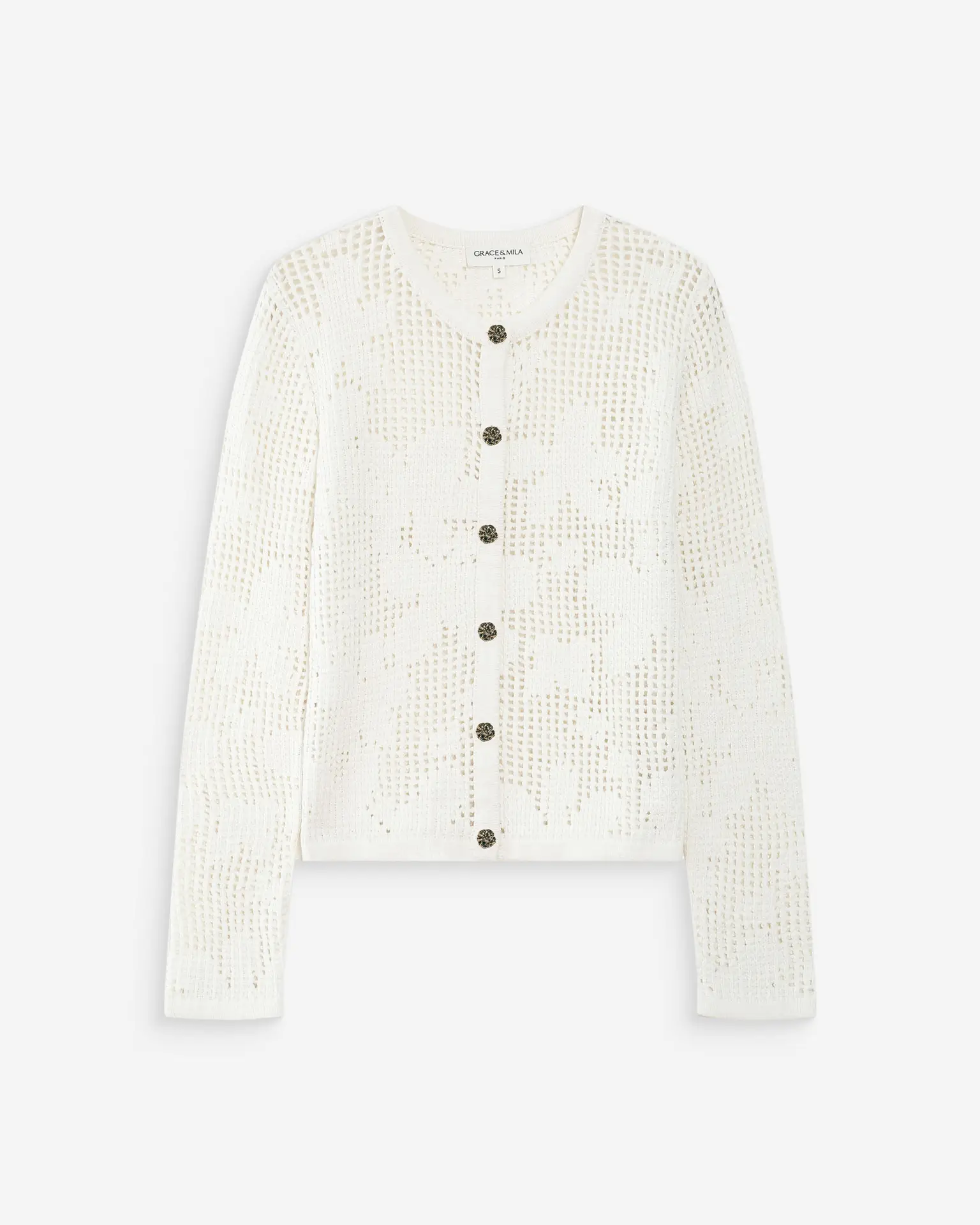 Designed with a clean, straight cut, this open-knit cardigan offers a relaxed yet refined shape that sits comfortably against the body without feeling oversized. The long sleeves provide balanced coverage, while the round neckline keeps the silhouette classic and easy to layer.
